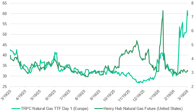 Chart 2: TTF-Henry Hub Spread: Transatlantic Natural Gas Price Dislocation. Source: LSEG Workspace, 22/03/2026